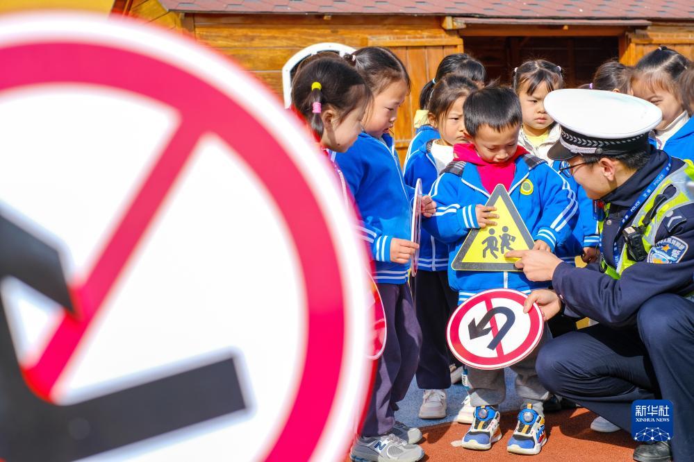 12月1日,在浙江省湖州市長興縣水口鄉中心幼兒園,長興縣公安局水口派出所交警中隊的民警指導小朋友辨識交通標誌。