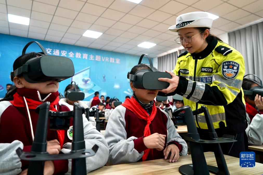 12月1日,江蘇省鹽城市濱海縣行知實驗小學的學生們進行交通安全VR體驗。