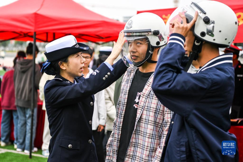 12月1日,在廣西物流職業技術學院,貴港市公安局交警支隊民警教學生如何正確佩戴頭盔。