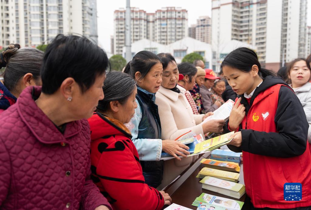 12月1日,志願者在貴州省銅仁市萬山區丹都街道旺家社區文化廣場為群眾發放防艾宣傳資料。