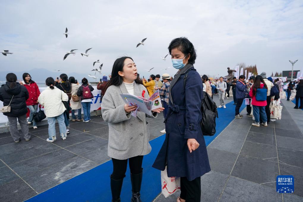 12月1日,一名工作人員(前左)在2023年世界艾滋病日雲南省主題宣傳月活動上向市民宣傳艾滋病相關知識。