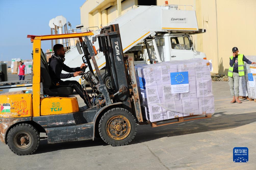 11月30日,在埃及北西奈省阿里什機場,工作人員轉運援助物資。
