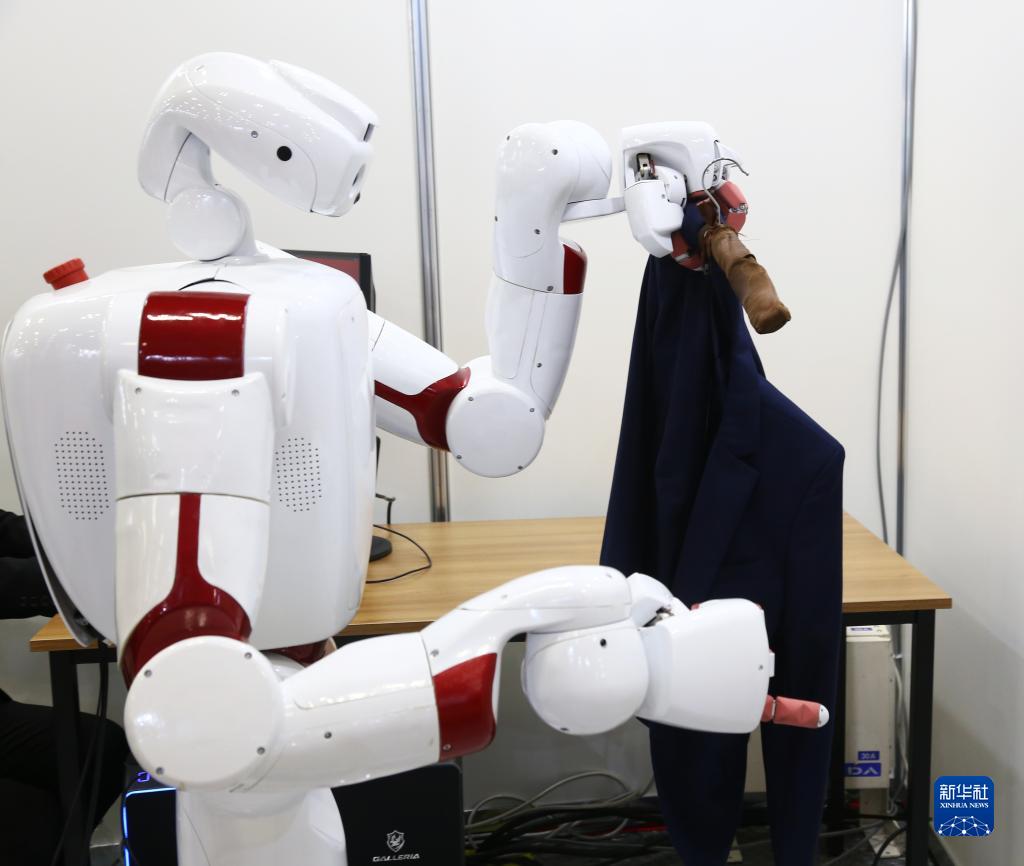 11月30日,在日本東京舉辦的日本國際機器人展上,早稻田大學的機器人展示往衣架上挂衣服。