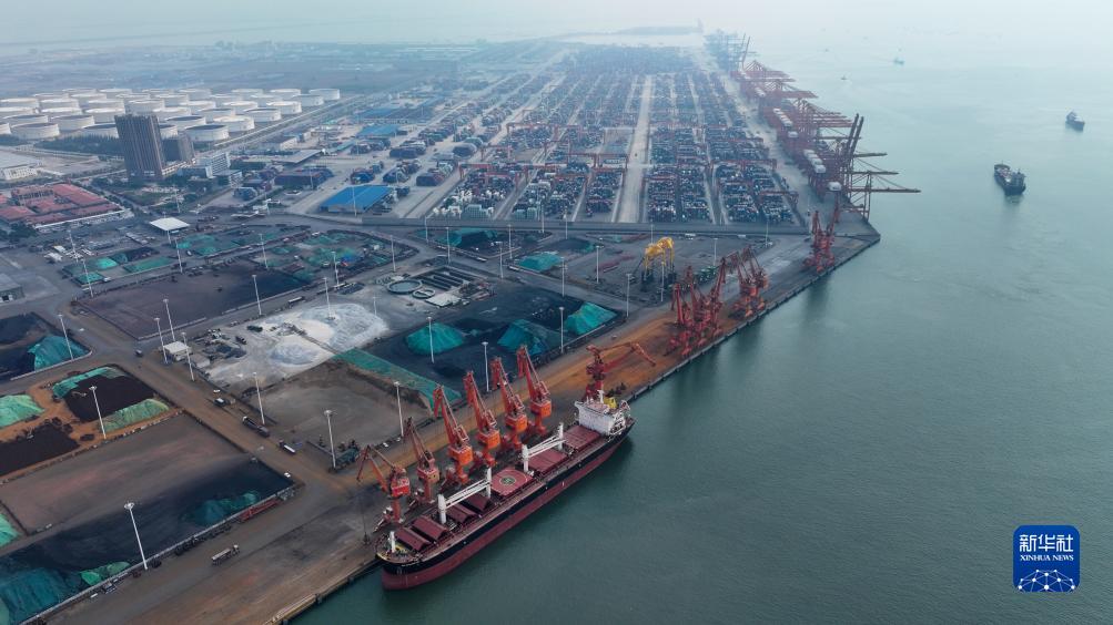 一艘貨輪停靠在欽州港碼頭西港區裝運貨物(11月24日攝,無人機照片)。