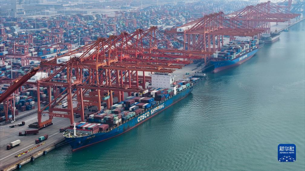 兩艘貨輪在欽州港集裝箱碼頭下卸集裝箱(11月24日攝,無人機照片)。