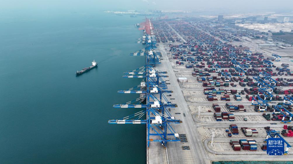 在欽州港碼頭,一艘貨輪正在駛離(11月24日攝,無人機照片)。