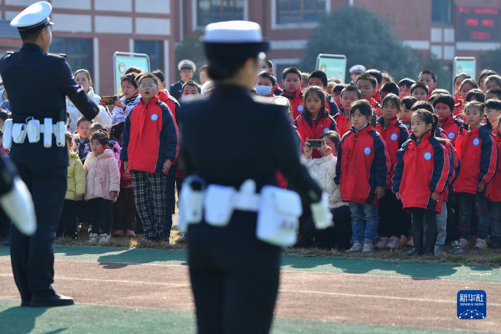 12月1日,在長沙市望城區新河學校,學生觀看交警手勢演示。