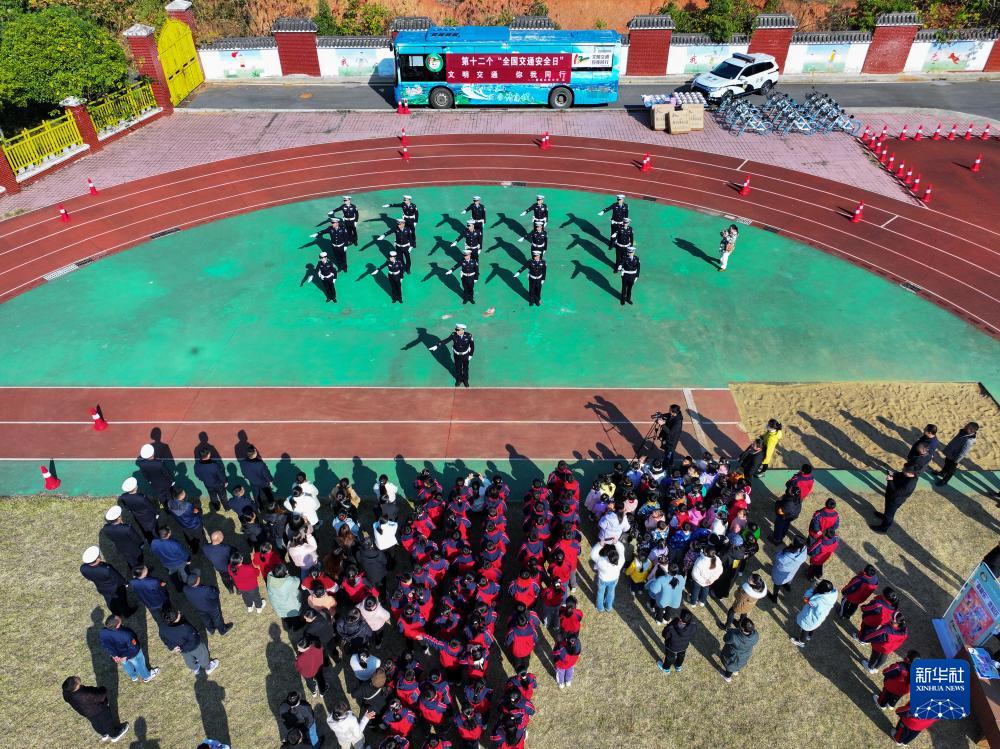12月1日,在長沙市望城區新河學校,學生觀看交警手勢演示(無人機照片)。