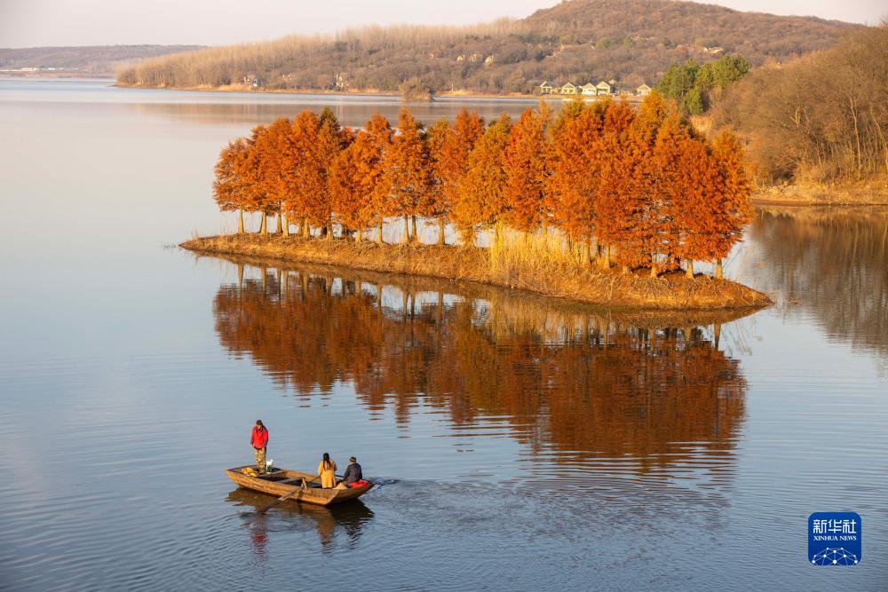 冬日時節,江蘇省盱眙縣天泉湖色彩斑斕,碧水與紅杉相映成趣,構成一幅美麗的冬日生態畫卷,吸引眾多游客前來體驗“人在畫中游”的美感。