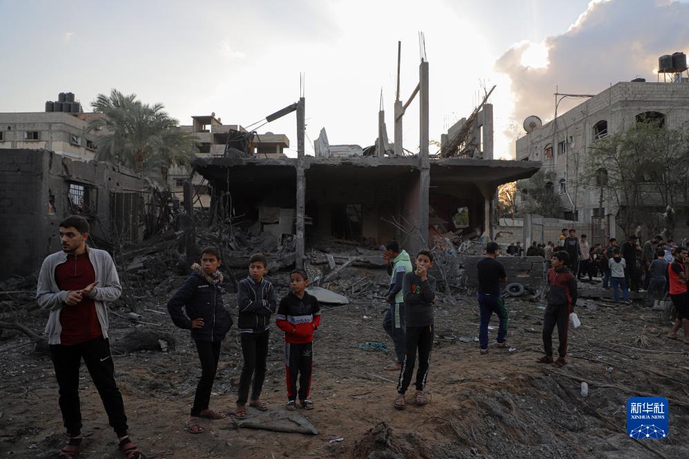 12月1日,人們聚集在加沙地帶南部城市汗尤尼斯一處被炸的建築周圍。