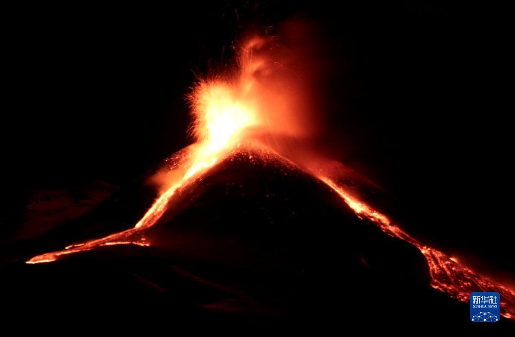 這是12月1日在意大利西西裏島卡塔尼亞拍攝的噴發中的埃特納火山。