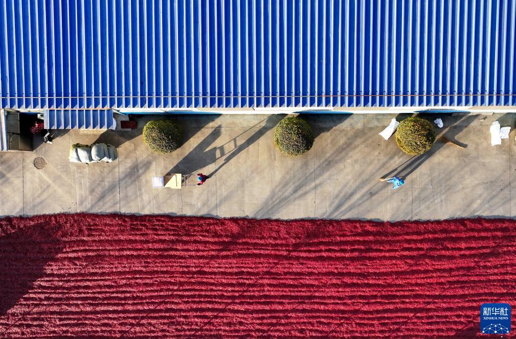 河北省望都縣一家辣椒加工企業內晾曬的辣椒(12月1日攝,無人機照片)。