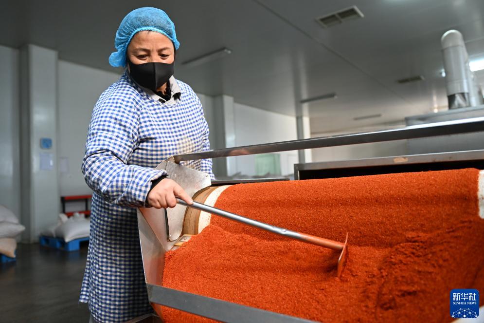 12月1日,河北省望都縣一家辣椒加工企業的工人在辣椒面生産線上工作。