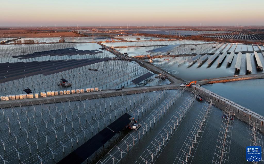 12月1日,工人在河北省唐山市豐南區黑沿子鎮漁光互補項目建設工地施工(無人機照片)。