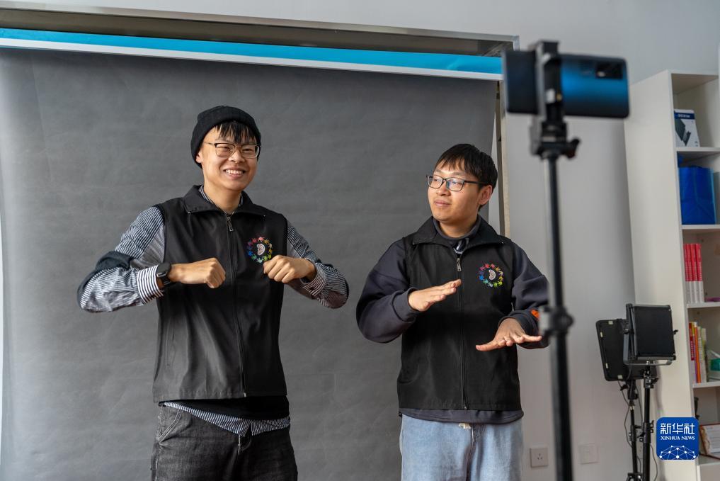 12月1日,在黑龍江省綏化學院,聽障學生在錄製手語視頻。