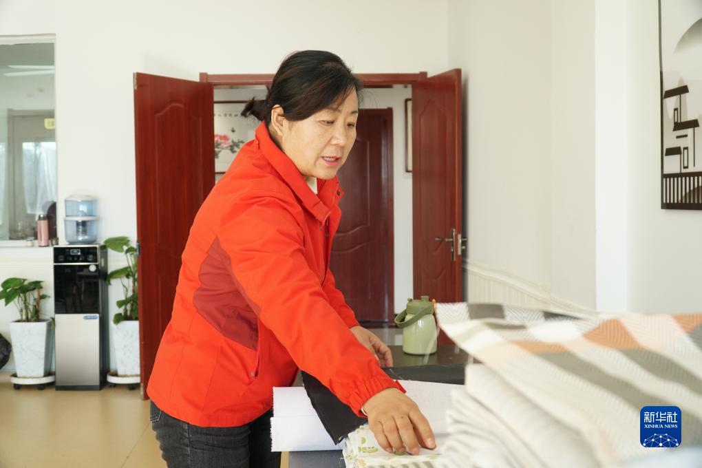 12月1日,在青海省西寧市星辰社會工作服務中心“智愛工作坊”輔助性就業基地,陳志芳在整理布料。