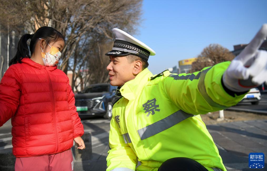 12月2日,在烏魯木齊南湖路附近,烏魯木齊市公安局交警支隊民警向一名小朋友宣講交通安全知識。