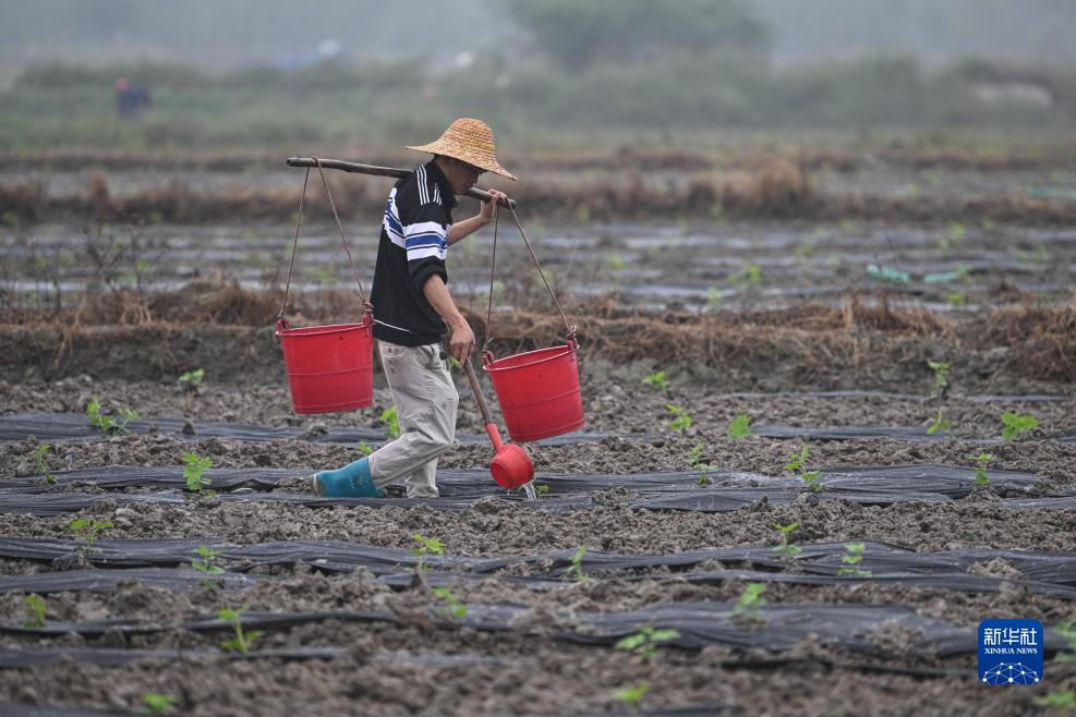 12月2日,農民在海南省屯昌縣楓木鎮為剛種下的楓木苦瓜苗澆水。