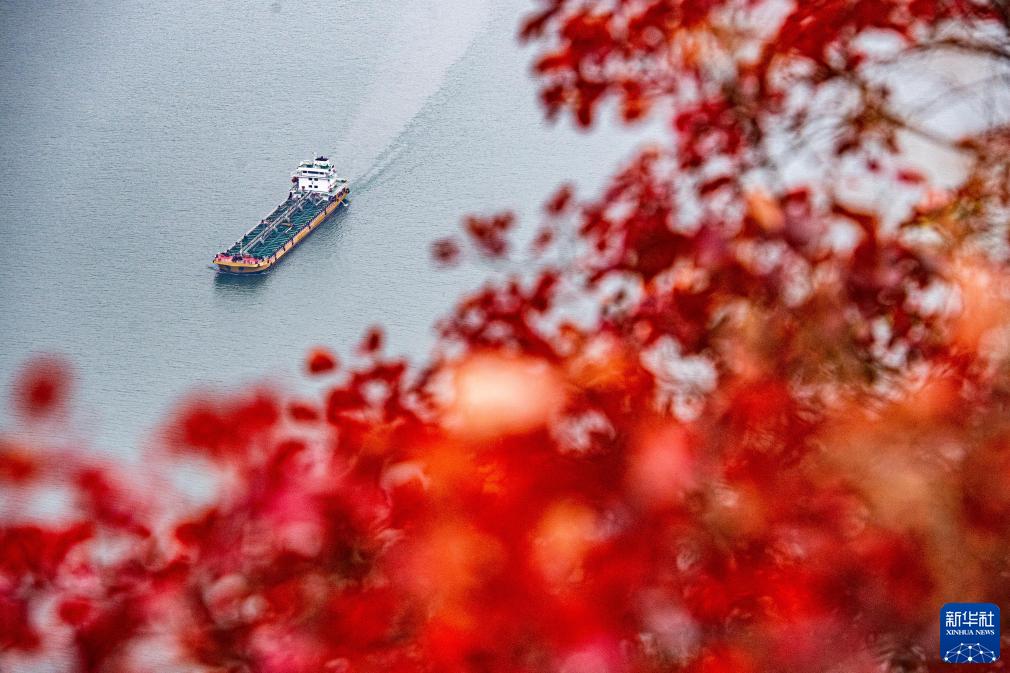 11月30日,船舶行駛在紅葉掩映下的長江三峽重慶市巫山縣水域。