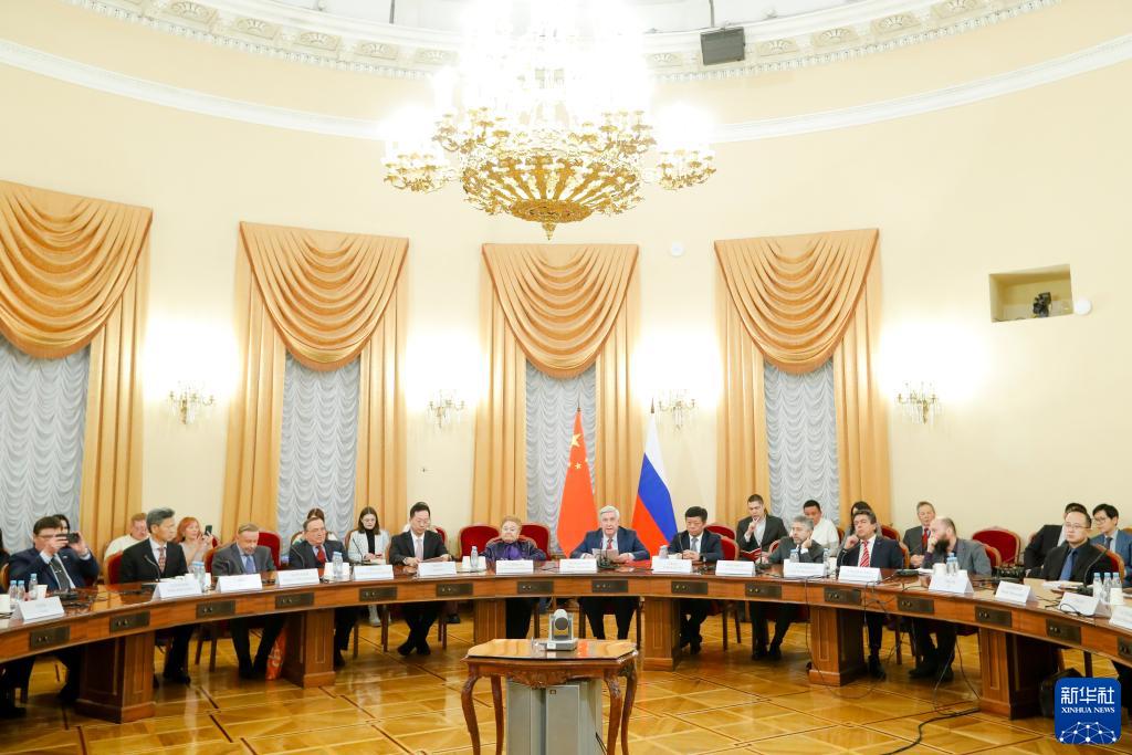 12月1日,俄羅斯國家杜馬第一副主席、俄中友協主席梅利尼科夫(前右六)在莫斯科舉行的慶祝中國改革開放45周年圓桌會議上發言。