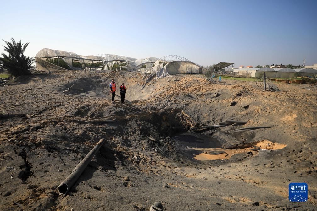 12月2日,在加沙地帶南部城市汗尤尼斯,人們查看以軍空襲後受損路面。