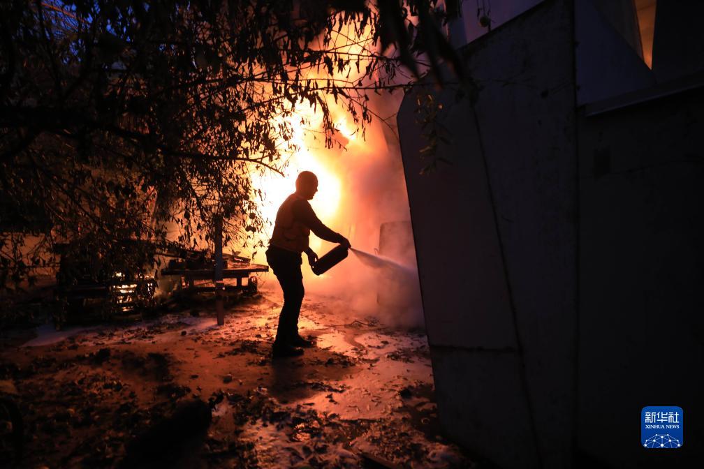 12月2日,在加沙地帶南部城市汗尤尼斯,一家塑料廠遭遇以軍轟炸後起火。