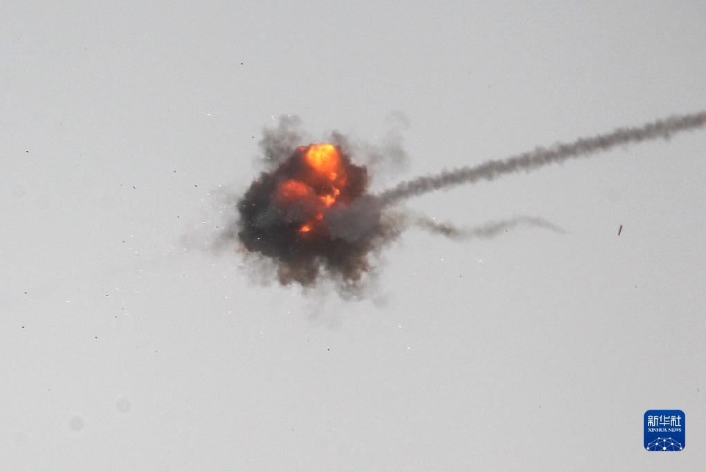 12月2日,在加沙地帶和以色列邊境地區以色列一側,以色列“鐵穹”導彈攔截從加沙地帶發射的火箭彈。