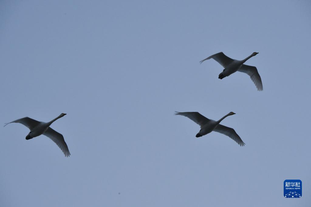 12月2日,天鵝在三門峽市天鵝湖國家城市濕地公園附近飛翔。