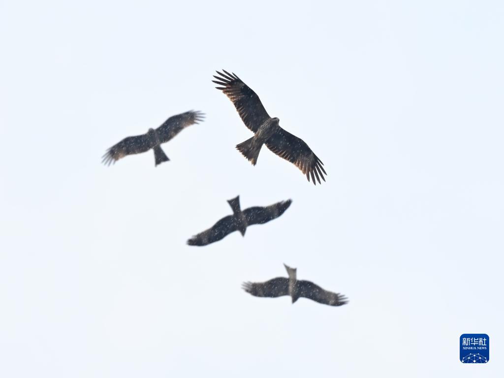 12月2日,幾隻黑鳶在福建省三明市泰寧縣大金湖上空飛翔。