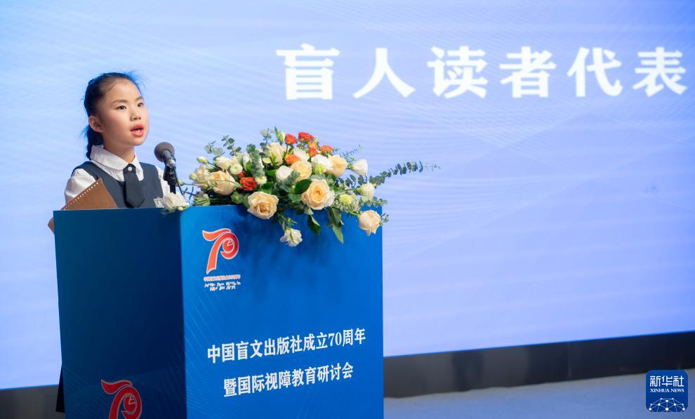 12月3日,在北京舉行的中國盲文出版社成立70周年暨國際視障教育研討會開幕式上,盲人讀者代表朱思若在開幕式上發言。