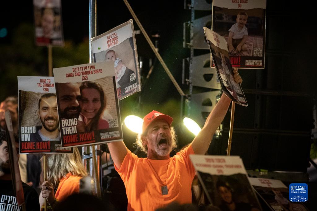 12月2日,一名男子在以色列特拉維夫參加集會,呼籲以色列政府採取措施讓全部被扣押在加沙地帶的人員盡快獲釋。