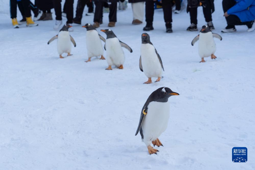 時值周末,哈爾濱極地公園的企鵝亮相戶外,上演冰雪巡游,吸引許多游客前來觀賞。目前正是黑龍江省哈爾濱市的冰雪旅游季。