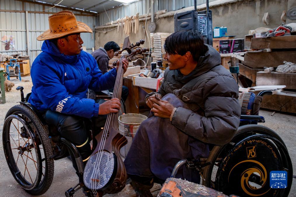 覺列(左)與製作扎念琴的工人交流(12月1日攝)。