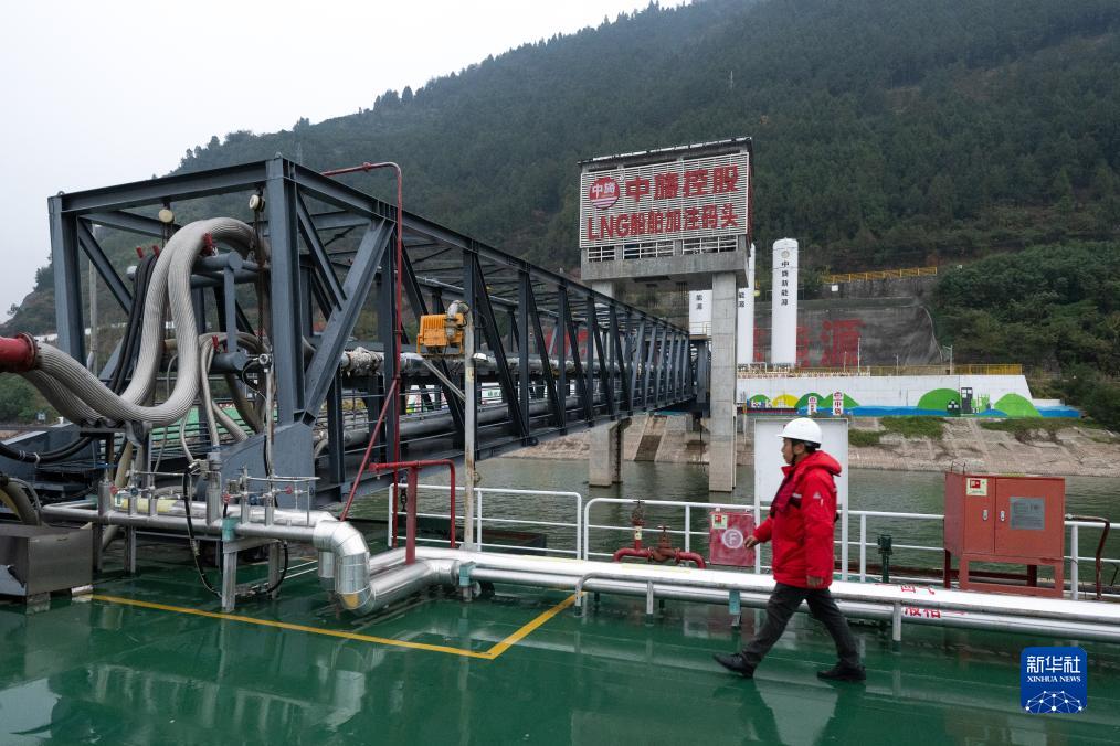 這是11月30日拍攝的位於湖北宜昌市的中旖新能源LNG加注站碼頭。該項目是交通運輸部水運行業應用液化天然氣試點示範項目,主要為過往船舶加注LNG液化天然氣及提供水上服務,從而有效降低船舶碳排放以及能源運輸成本。