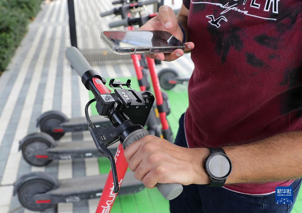 12月3日,一名參觀者在聯合國氣候變化迪拜大會“綠區”掃碼使用共享腳踏車。