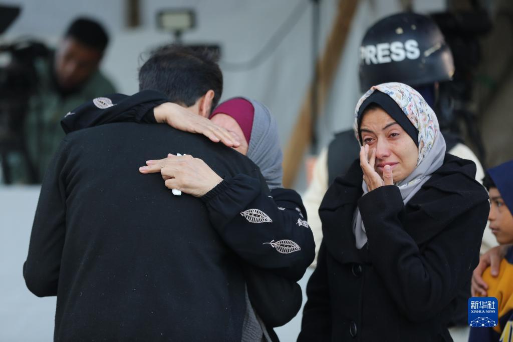 12月3日,在加沙地帶代爾拜拉赫的一家醫院,巴勒斯坦人哀悼在以軍襲擊中遇難的親屬。
