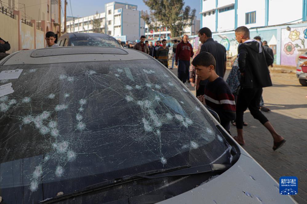 12月3日,在加沙地帶南部城市汗尤尼斯的一所學校附近,人們查看以軍襲擊後的受損情況。