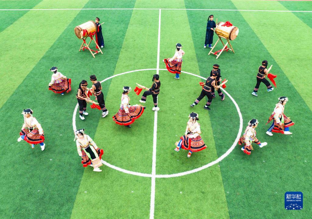 12月4日,學生在貴州省羅甸縣第二小學學跳苗族蘆笙舞(無人機照片)。