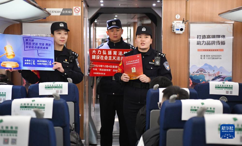 12月4日,瀋陽鐵路公安局瀋陽公安處乘警支隊民警在列車上向乘客宣傳憲法知識。