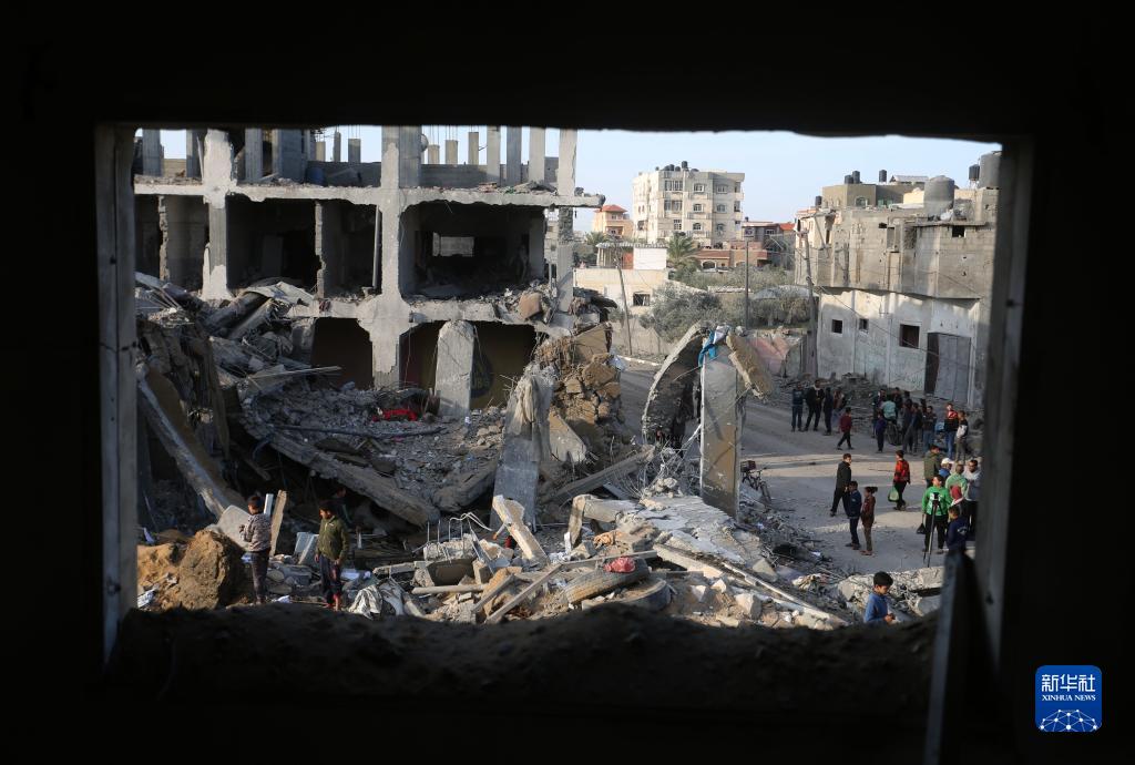 12月4日,在加沙地帶南部城市拉法,人們查看以軍空襲後的住宅廢墟。