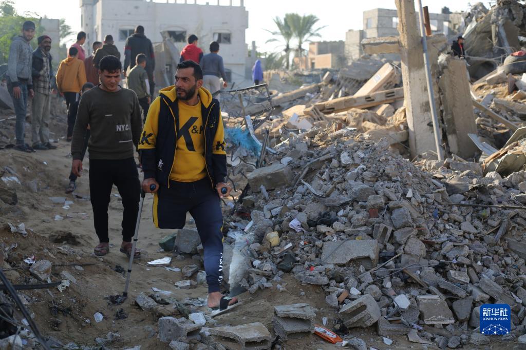 12月4日,在加沙地帶南部城市拉法,人們查看以軍空襲後的住宅廢墟。