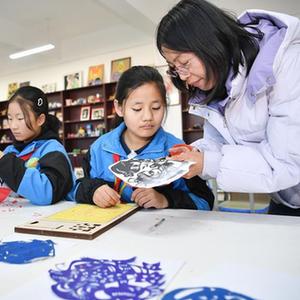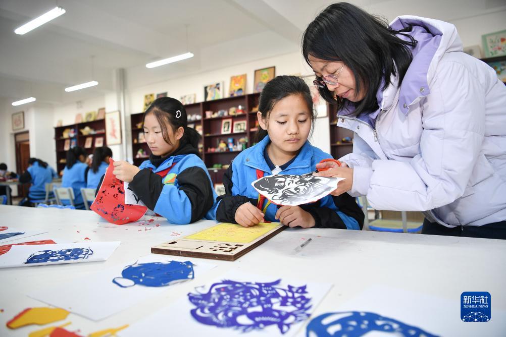 隆德縣第二中學老師在指導學生學習剪紙技藝(11月30日攝)。