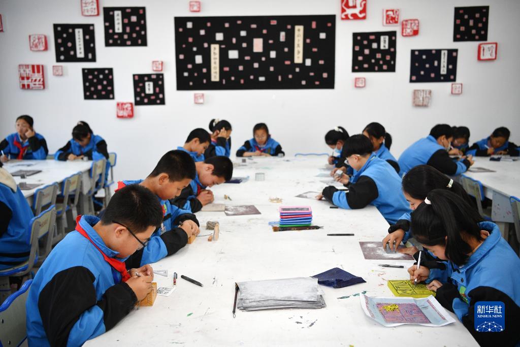 隆德縣第二中學學生在學習篆刻(11月30日攝)。