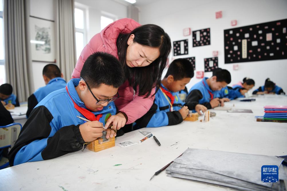 隆德縣第二中學學生在老師指導下學習篆刻(11月30日攝)。