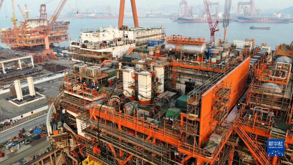 在海洋石油工程(青島)有限公司生産基地,工人對“海洋石油122”進行上部模塊總裝作業(12月4日攝,無人機照片)。