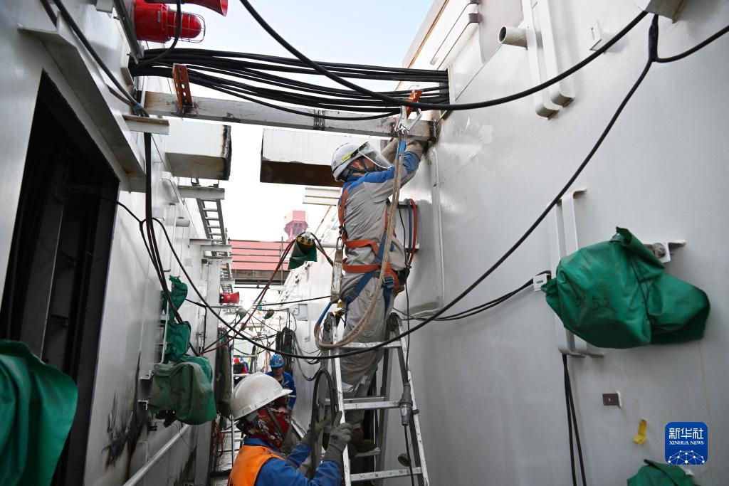 12月4日,工人在建造中的“海洋石油122”上進行電纜鋪裝作業。
