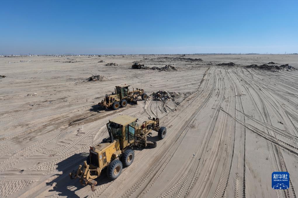 這是12月4日在科威特傑赫拉省拍攝的南薩阿德阿卜杜拉新城基礎設施項目施工現場(無人機照片)。