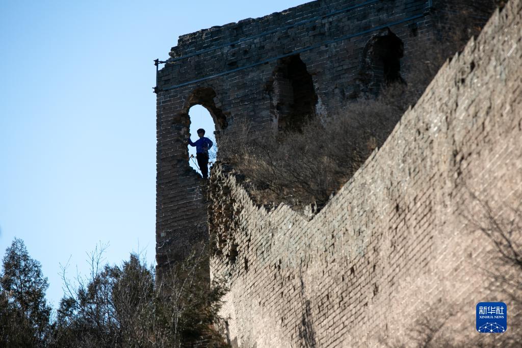 游客在古北口長城將軍樓游覽(11月14日攝)。靠近將軍樓一側的墻體保留着長城抗戰留下的炮彈洞和彈坑。