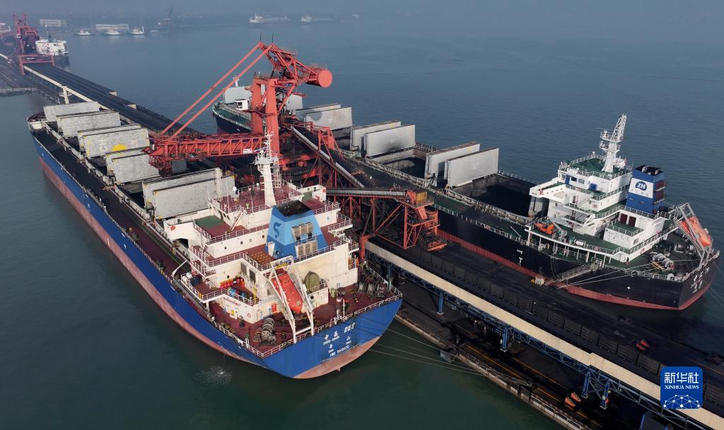 12月5日,兩艘輪船靠泊在唐山港曹妃甸港區國投曹妃甸港口有限公司煤炭碼頭裝貨(無人機照片)。