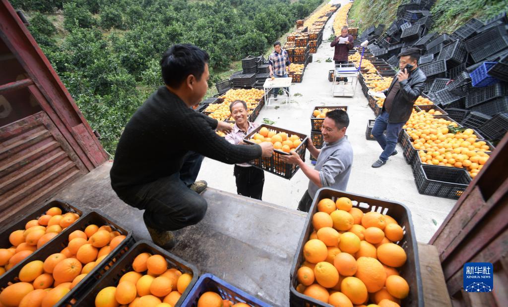 近日,貴州省羅甸縣的臍橙迎來收穫季,農民在臍橙種植基地採摘、搬運臍橙,供應市場。